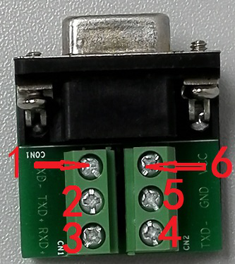 ✅接线转换头定义见丝印标识:如下图 1 RXD+ 2 TXD+ 3 TXD- 4 RXD- 5 GND 6 VCC(注意:本产品不提供VCC供电)。