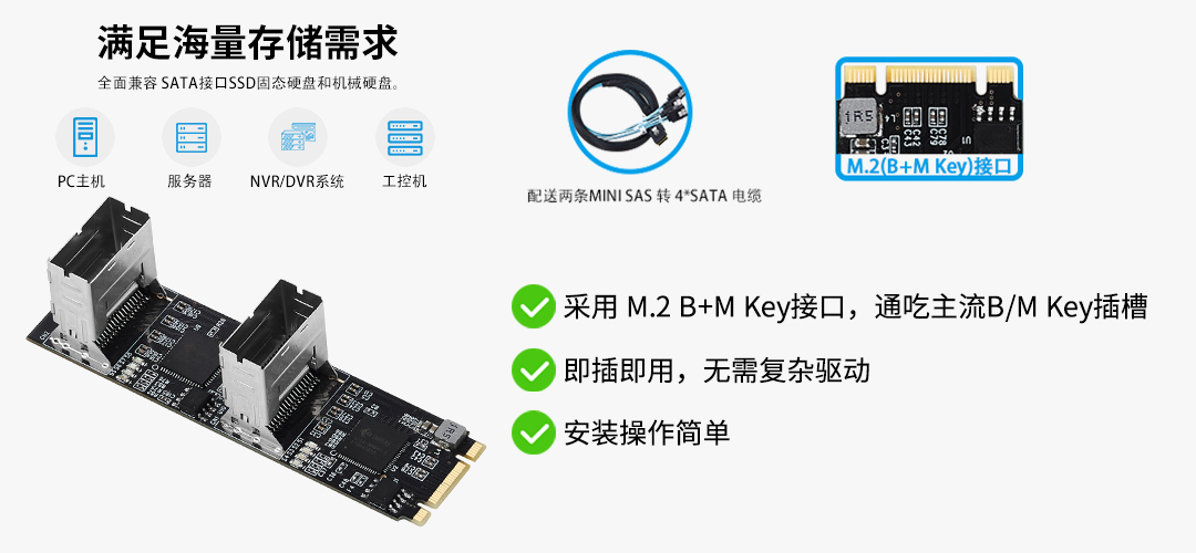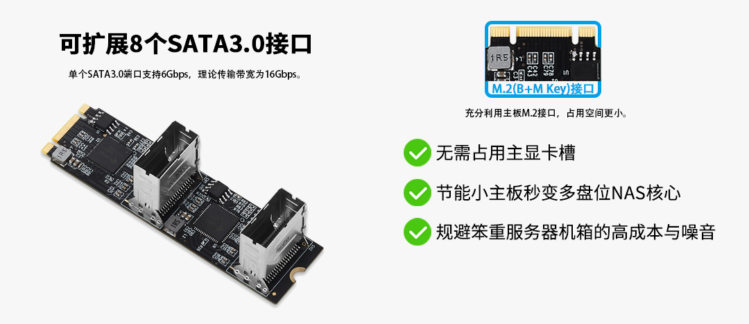 海量接口: 它能将主板上一个M.2插槽,神奇地扩展为8个独立的原生SATA 3.0 (6Gbps)接口,无论是高速SSD还是大容量HDD,都能发挥其全部性能。