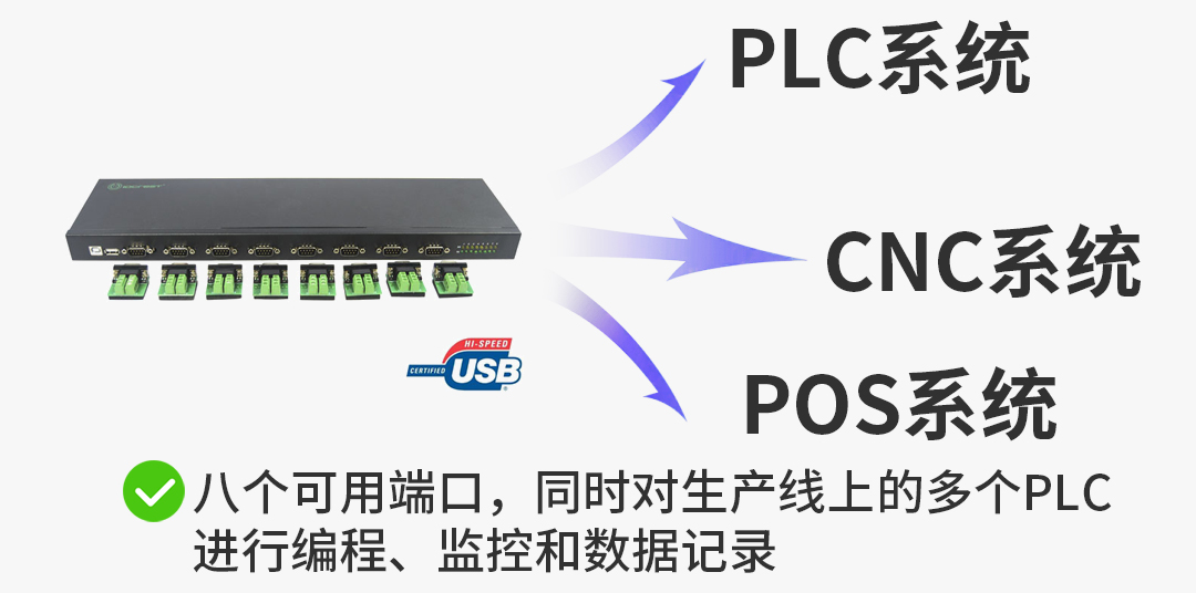这款适配器真正的强大之处在于其多功能性。它是 适用于PLC / CNC / POS系统的终极USB串口适配器,允许单个操作员或SCADA系统与各种各样的设备进行通信。拥有八个可用端口,您可以: